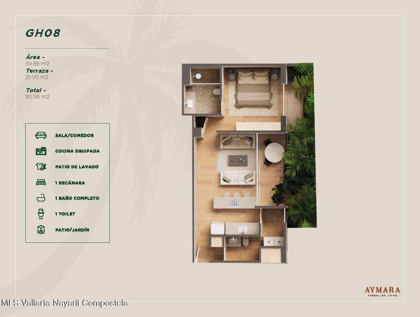 Aymara Versalles se encuentra en el corazon de la Colonia Versalles, en las calles Aldanaca y Berlin, una de las zonas de mas rapido crecimiento de Puerto Vallarta. El complejo cuenta con 43 unidades residenciales y una selecta variedad de practicos locales comerciales, dentro de un concepto moderno que combina un diseno cuidado, funcionalidad y una ubicacion muy conveniente. Las residencias tienen entre 64,55 m2 y 143,88 m2, con distribuciones de 1, 2 y 3 dormitorios disenadas tanto para una vida comoda como para un solido potencial de inversion. El proyecto ofrece acabados de alta calidad, amplias terrazas y acogedoras zonas comunes que complementan el dinamico estilo de