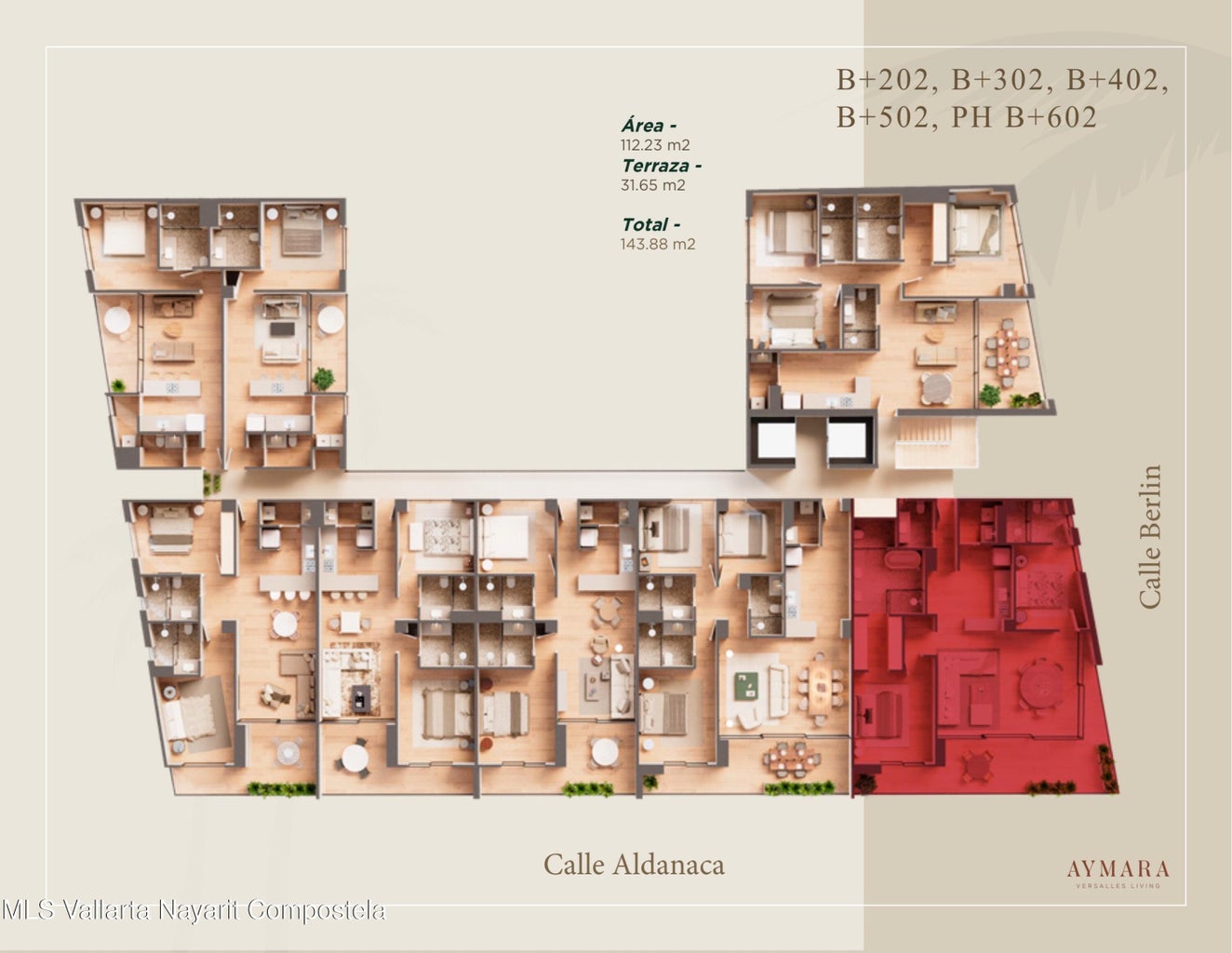 Aymara Versalles se encuentra en el corazon de la Colonia Versalles, en las calles Aldanaca y Berlin, una de las zonas de mas rapido crecimiento de Puerto Vallarta. El complejo cuenta con 43 unidades residenciales y una selecta variedad de practicos locales comerciales, dentro de un concepto moderno que combina un diseno cuidado, funcionalidad y una ubicacion muy conveniente. Las residencias tienen entre 64,55 m2 y 143,88 m2, con distribuciones de 1, 2 y 3 dormitorios disenadas tanto para una vida comoda como para un solido potencial de inversion. El proyecto ofrece acabados de alta calidad, amplias terrazas y acogedoras zonas comunes que complementan el dinamico estilo de
