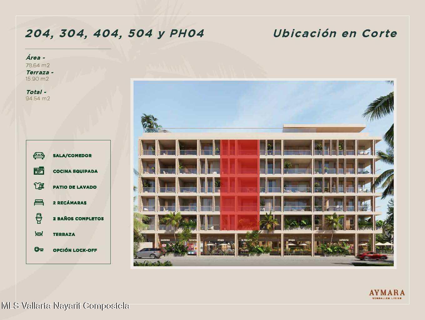Aymara Versalles se encuentra en el corazon de la Colonia Versalles, en las calles Aldanaca y Berlin, una de las zonas de mas rapido crecimiento de Puerto Vallarta. El complejo cuenta con 43 unidades residenciales y una selecta variedad de practicos locales comerciales, dentro de un concepto moderno que combina un diseno cuidado, funcionalidad y una ubicacion muy conveniente. Las residencias tienen entre 64,55 m2 y 143,88 m2, con distribuciones de 1, 2 y 3 dormitorios disenadas tanto para una vida comoda como para un solido potencial de inversion. El proyecto ofrece acabados de alta calidad, amplias terrazas y acogedoras zonas comunes que complementan el dinamico estilo de