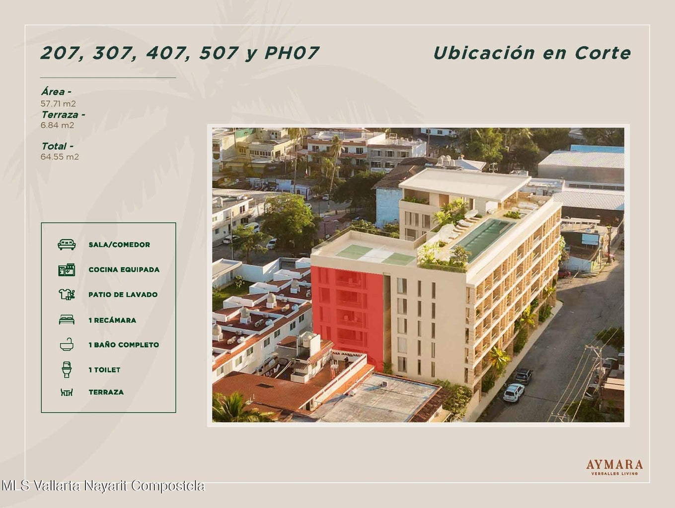 English below Aymara Versalles se encuentra en el corazon de la Colonia Versalles, en las calles Aldanaca y Berlin, una de las zonas de mas rapido crecimiento de Puerto Vallarta. El complejo cuenta con 43 unidades residenciales y una selecta variedad de practicos locales comerciales, dentro de un concepto moderno que combina un diseno cuidado, funcionalidad y una ubicacion muy conveniente. Las residencias tienen entre 64,55 m2 y 143,88 m2, con distribuciones de 1, 2 y 3 dormitorios disenadas tanto para una vida comoda como para un solido potencial de inversion. El proyecto ofrece acabados de alta calidad, amplias terrazas y acogedoras zonas comunes que complementan el dinamico estilo de