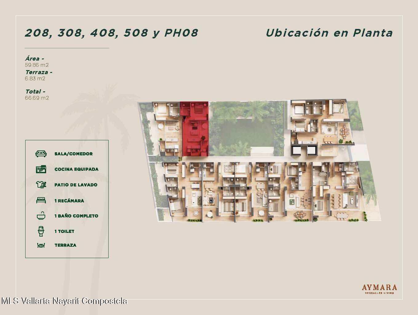 English below Aymara Versalles se encuentra en el corazon de la Colonia Versalles, en las calles Aldanaca y Berlin, una de las zonas de mas rapido crecimiento de Puerto Vallarta. El complejo cuenta con 43 unidades residenciales y una selecta variedad de practicos locales comerciales, dentro de un concepto moderno que combina un diseno cuidado, funcionalidad y una ubicacion muy conveniente. Las residencias tienen entre 64,55 m2 y 143,88 m2, con distribuciones de 1, 2 y 3 dormitorios disenadas tanto para una vida comoda como para un solido potencial de inversion. El proyecto ofrece acabados de alta calidad, amplias terrazas y acogedoras zonas comunes que complementan el dinamico estilo de