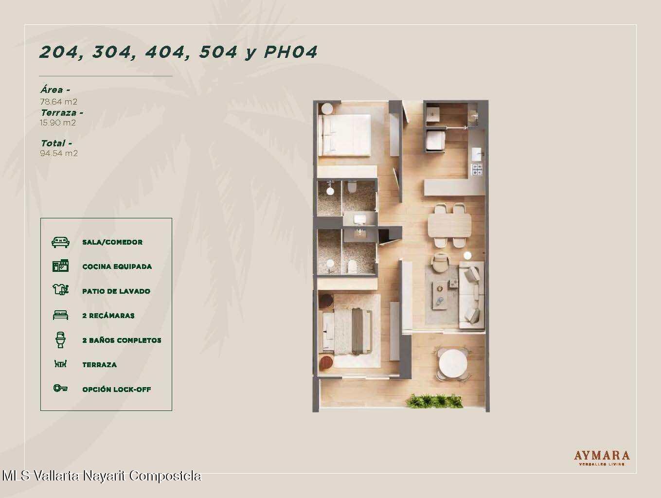 English below Aymara Versalles se encuentra en el corazon de la Colonia Versalles, en las calles Aldanaca y Berlin, una de las zonas de mas rapido crecimiento de Puerto Vallarta. El complejo cuenta con 43 unidades residenciales y una selecta variedad de practicos locales comerciales, dentro de un concepto moderno que combina un diseno cuidado, funcionalidad y una ubicacion muy conveniente. Las residencias tienen entre 64,55 m2 y 143,88 m2, con distribuciones de 1, 2 y 3 dormitorios disenadas tanto para una vida comoda como para un solido potencial de inversion. El proyecto ofrece acabados de alta calidad, amplias terrazas y acogedoras zonas comunes que complementan el dinamico estilo de