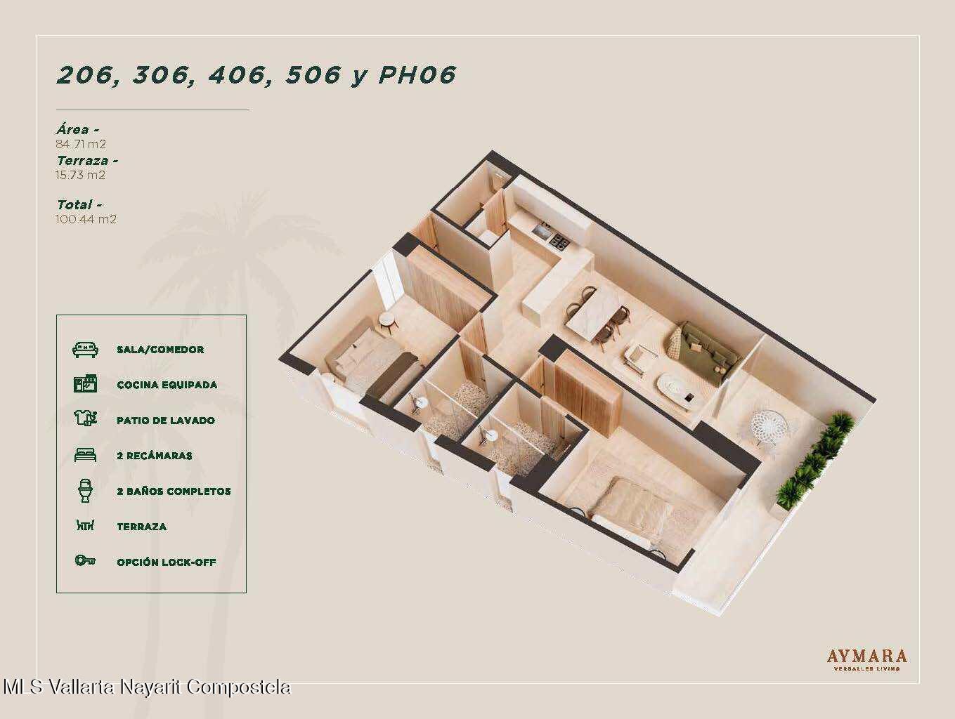 Aymara Versalles se encuentra en el corazon de la Colonia Versalles, en las calles Aldanaca y Berlin, una de las zonas de mas rapido crecimiento de Puerto Vallarta. El complejo cuenta con 43 unidades residenciales y una selecta variedad de practicos locales comerciales, dentro de un concepto moderno que combina un diseno cuidado, funcionalidad y una ubicacion muy conveniente. Las residencias tienen entre 64,55 m2 y 143,88 m2, con distribuciones de 1, 2 y 3 dormitorios disenadas tanto para una vida comoda como para un solido potencial de inversion. El proyecto ofrece acabados de alta calidad, amplias terrazas y acogedoras zonas comunes que complementan el dinamico estilo de