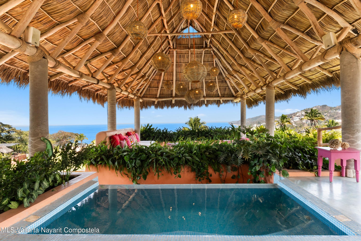 This unique villa with 360 degree views and its own lush garden, features four beautifully decorated bedroom suites, a swimming pool, a tree-top hot-tub with ocean views, and a Mexican-style open air living area with a rooftop living room and kitchen/dining room dramatically linked by a bridge. This property has views not only of the ocean and coastline but also of the lush foothills of the Sierra Madre and the energetic town of Sayulita. Each of the colorful accommodations has its own bathroom with shower, king size bed, fan, a-c and indoor and outdoor sitting areas. All rooms share views of the walled garden, pool, town, and surrounding hills.